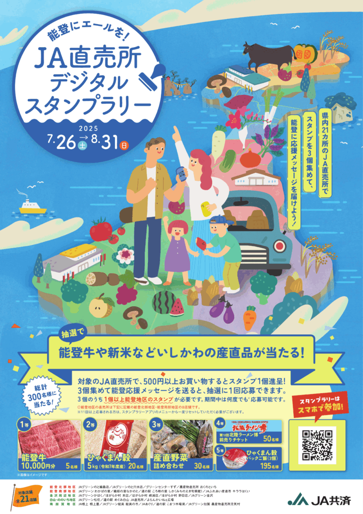 JA共済連石川では、7月26日(土)~8月31日(日)の期間、能登復興応援プロジェクトの一環として、抽選で能登牛や新米など石川の産直品が当たる『JA直売所デジタルスタンプラリー』を実施しています。